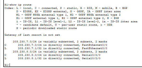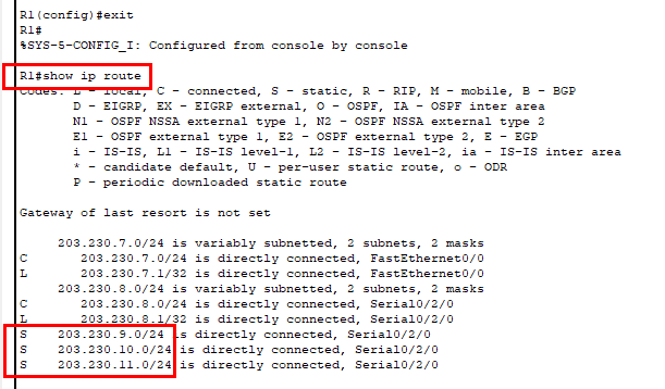 show ip route 명령어로 설정이 잘들어갔는지 확인해보면 직접설정한 ip 부분은 S라고 표시가 되어있다.