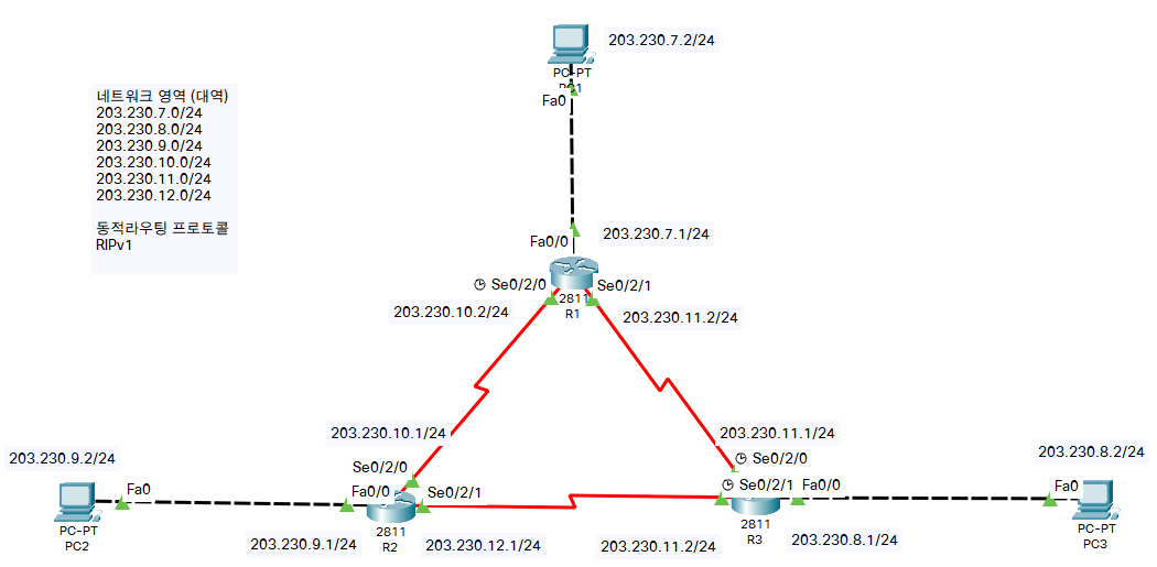 각 라우터별로 router rip -> network 명령어로 연결된 네트워크를 입력해주면 끝