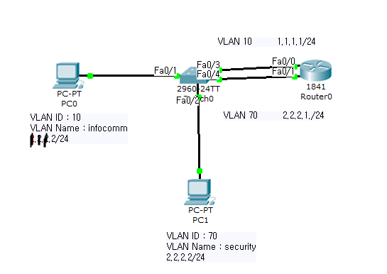 예제 2는 VLAN간 핑테스트를 하기위한 실습 예제이다.