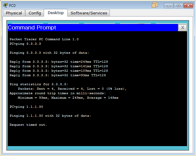 vlan 30 pc간에는 핑테스트가 정상적이고 다른 vlan인 vlan 10과는 통신이 되지않는것을 확인할 수 있다.
