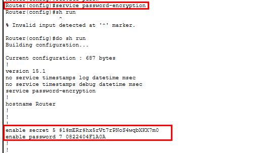 sh run에서 비밀번호를 노출하기 싫으면 아래처럼 service password-encryption 명령어를 입력하면 된다.